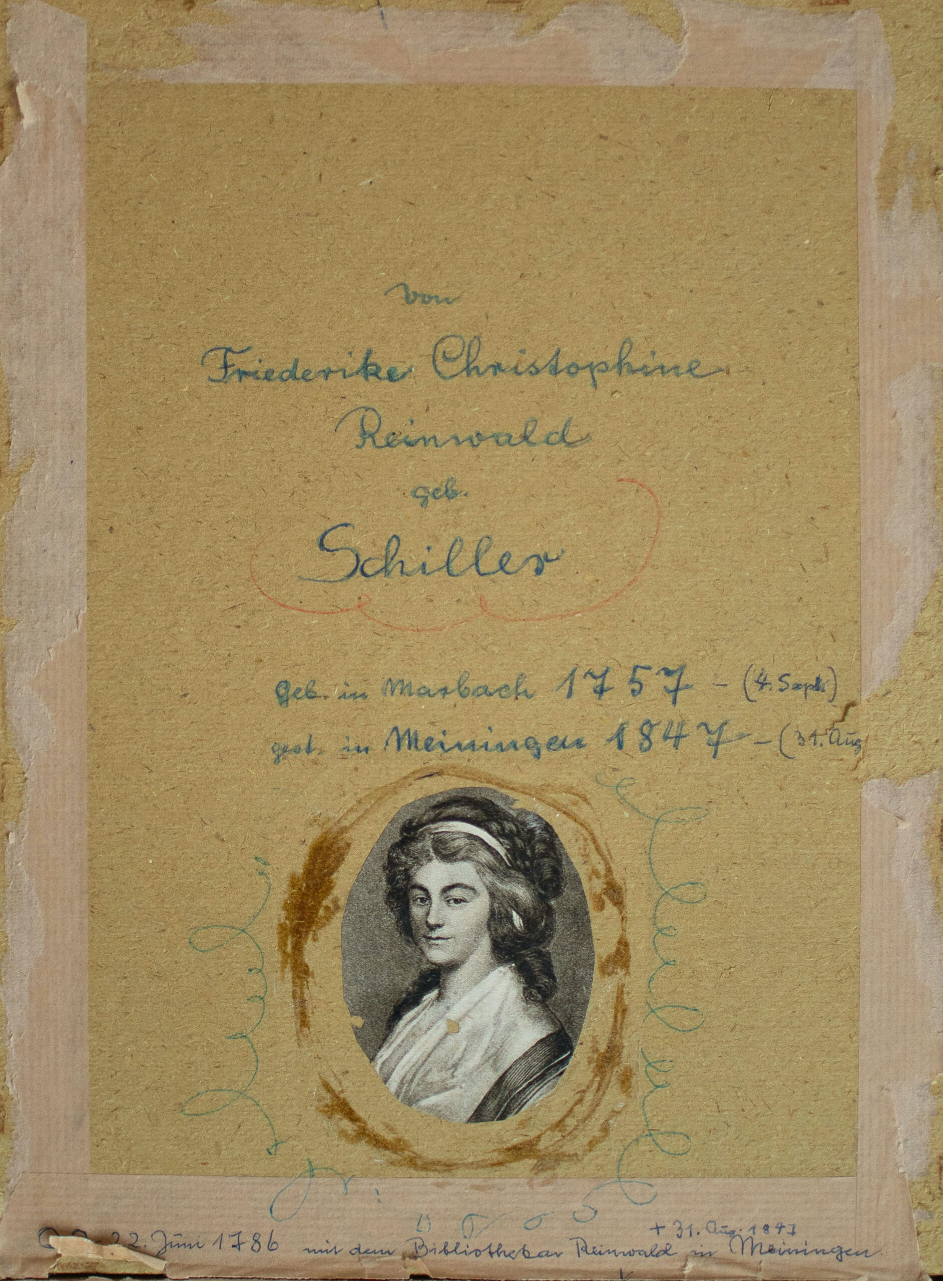 die „erste Heldin“ Friedrich Schillers war nicht etwa eine griechische Heroin oder die pflichtbewusst geliebte Mutter, sondern die zwei Jahre ältere Schwester Elisabetha Friederike Christophine (verh. Reinwald 1757-1847), ein kommunikatives, kluges und schöngeistiges Naturell, das – bevor der Bruder halbwüchsig literarisch brillierte – unangefochten als „künstlerische Hand“ der Familie firmierte. Die in Korrespondenz und frühen Biografien besungenen „meisterlich feinen“ Arbeiten der Ältesten waren zweifelsohne Zeugnis einer schöpferischen Begabung, die allerdings über die bürgerliche Mädchenbildung hinaus nicht weiter gefördert wurde, flossen Geld und Erwartungen doch in den einzigen Sohn. Die intrinsisch motivierte Christophine zeichnete Landschaften und Stillleben, kopierte klassische und zeitgenössische Motive, versah Briefe und Alben mit feinsinnigen Illustrationen, fertigte Miniaturen und aquarellzarte Porträts von Freunden und Verwandten. Austausch und Bestärkung fand sie bei Jugend- und Lebensfreundin Ludovike Simanowiz, deren Bildungsweg erfrischend anders verlaufen war. Letztere hatte, von Eltern- und Herrscherhaus adäquat gefördert, an Instituten in Stuttgart und Paris bei namhaften Malern studieren und sich wenig später eine lukrative Position am württembergischen Hofe sichern können.
