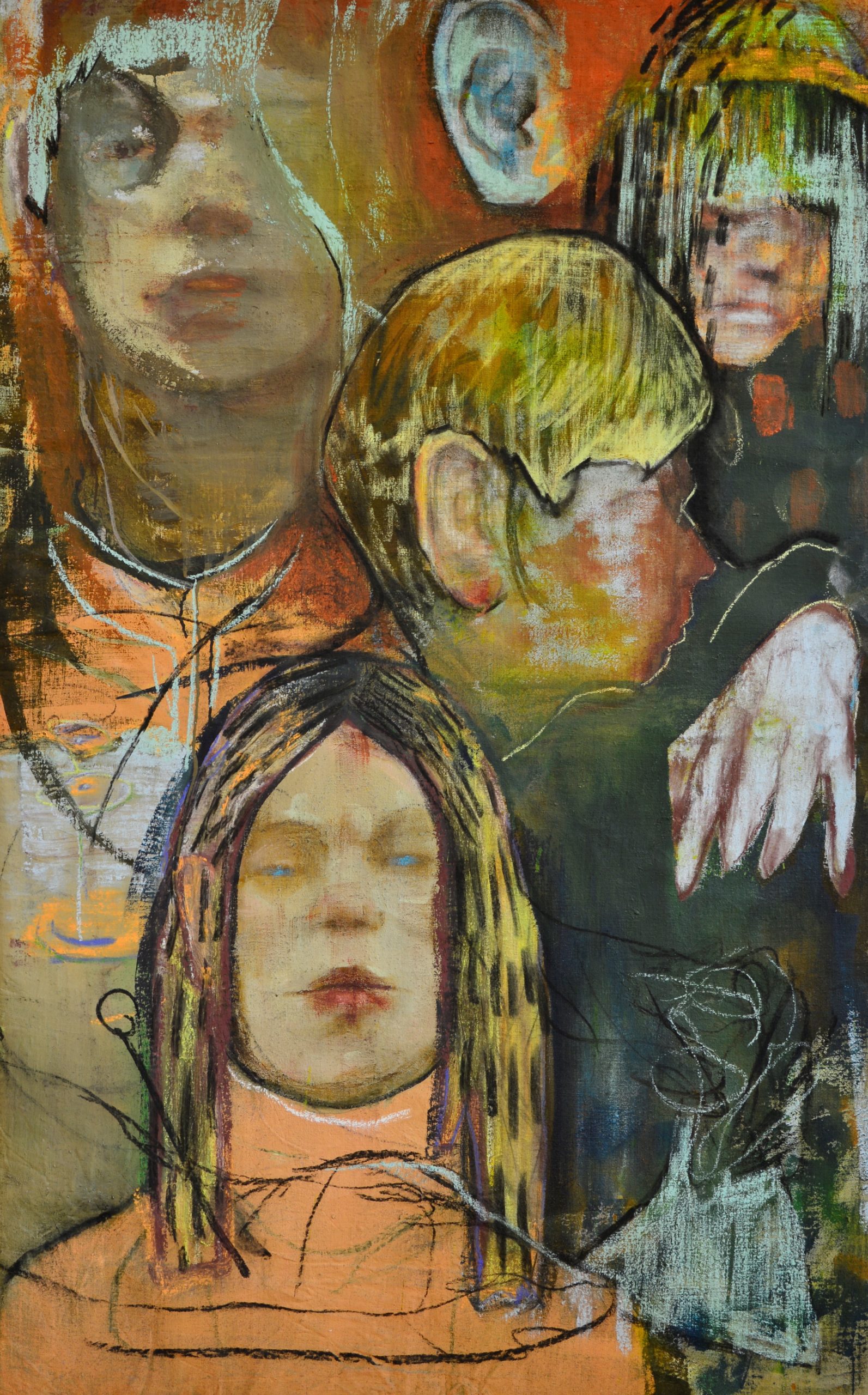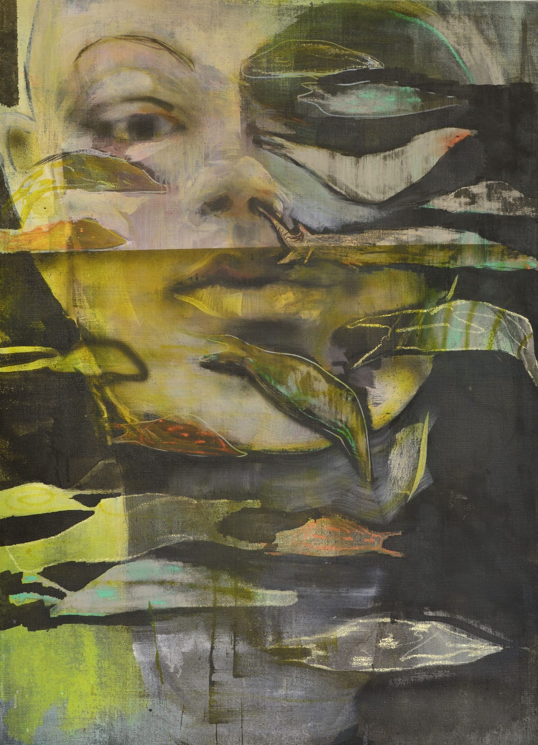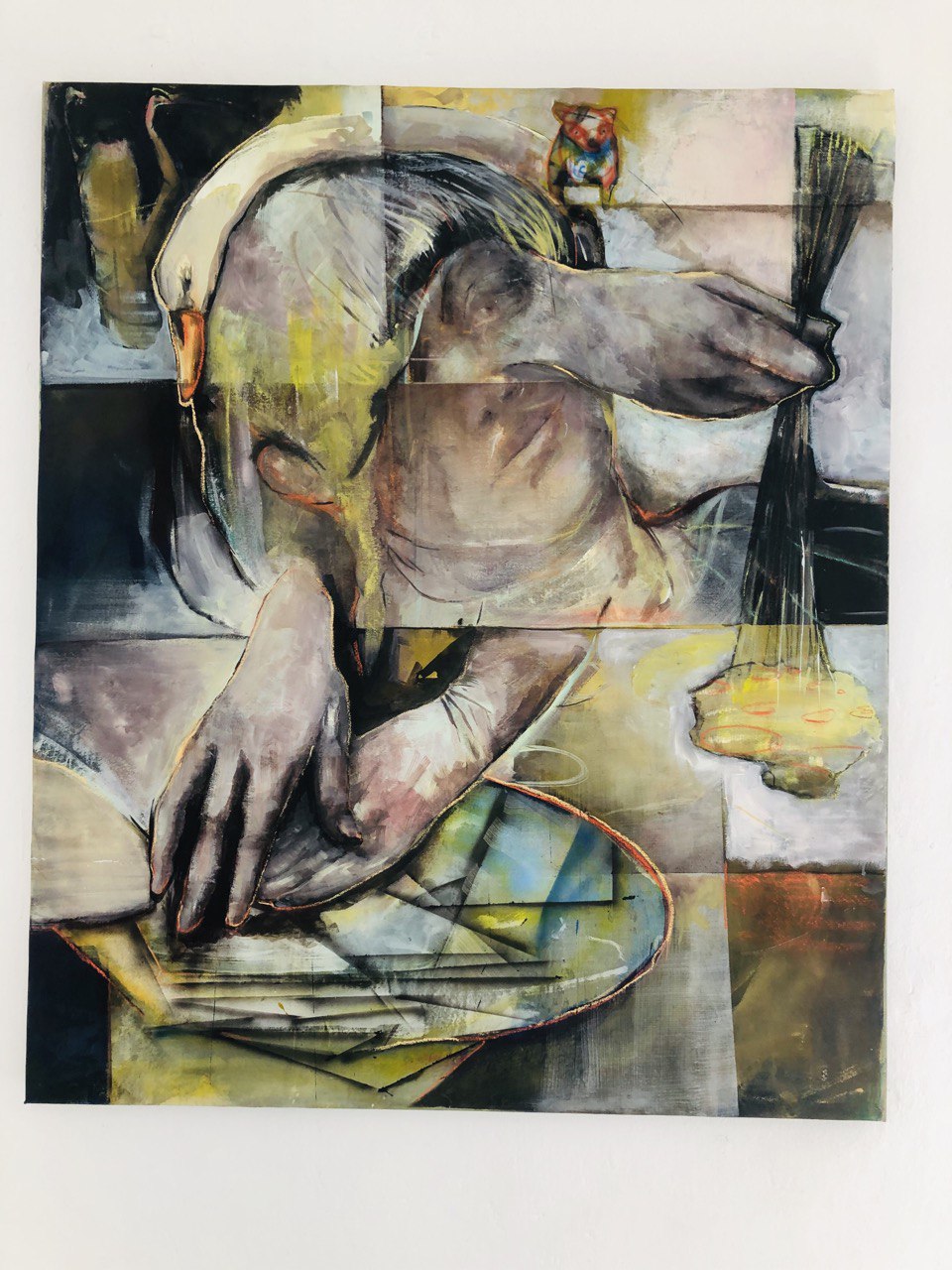 Lisa Wölfel (geboren 1988 in Schweinfurt, Absolventin der Akademie der Bildenden Künste in Nürnberg) hat sich während des Lockdowns vermehrt Kleinformaten gewidmet, die ausschnittartig zeigen, was sie wohl sonst im großen Gemälde formulieren würde. Ihre aktuellen Werke wirken deshalb nicht unvollständig, sondern vielmehr intim, berührend und unmittelbar. Die sich derzeit sich in Residenz in Aschersleben befindende Künstlerin zeigt aber auch großformatige Malerei, unter anderem ein Werk, was sie nun nach einem Zeitraum von zwei Jahren abgeschlossen hat. Im Vergleich zu früheren Arbeiten der Künstlerin, scheinen sich ihre Figuren nun mehr miteinander zu beschränken und aufeinander zu beziehen, ihre Figuren haben mehr Kontakt zueinander.
