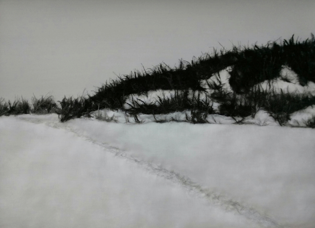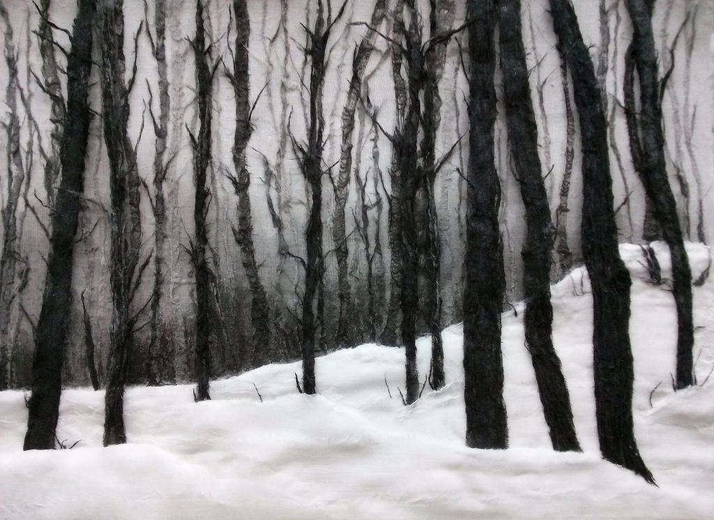 Jinran Kim, Winterlandschaft 1, 50×70 cm, 2018, Gaze, Papier, Asche