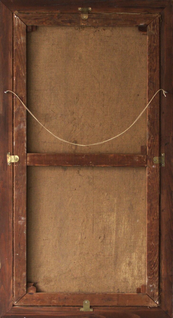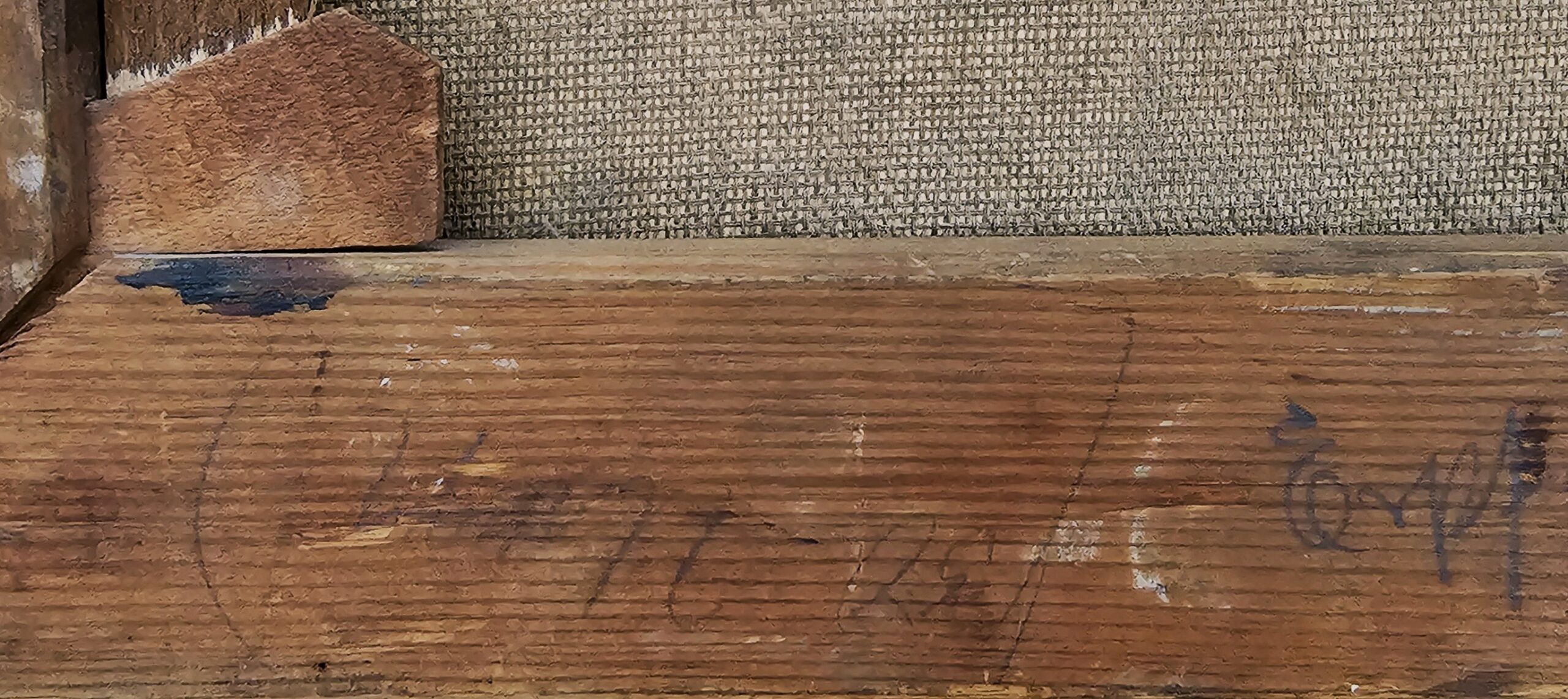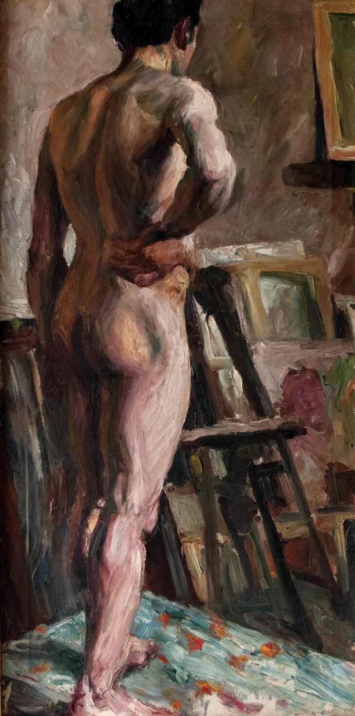Der Dargestellte ist jung, hat rabenschwarzes Haar und eine attraktive Kehrseite, auf der sich Licht und Farben in detailliertem Muskelspiel brechen – das perfekte Modell steht offensichtlich in Fensternähe. Der hervorragend gemalte, pastos binnenstrukturierte und stellenweise leicht anorganisch kolorierte Schöne nimmt etwa die Hälfte des Längsformats ein und gibt den Blick auf ein Atelier frei, in dem sich Staffeleien, Leinwände und Keilrahmen stapeln. Der zweifelsohne geschäftige Meister – vom Stil könnte man einen Berliner zwischen 1900 und 1920 vermuten – gibt sich weder über die Motive im Hintergrund zu erkennen, auf denen sich schwere Pigmentwolken ballen, noch über Signatur oder Stempel. Die Arbeit mag Studiencharakter haben, die Handschrift aber ist die eines Könners. Dreht man das noch originalgerahmte Werk um, zeigen sich am unteren Keilrahmenrand teils unleserliche Bleistiftannotationen u.a. der Name „Jacobi“, dem nach eingehender stilistischer Prüfung keine Urheberschaft mit einem Gleichbenannten zugedacht werden kann. Ob die schwer erkennbare „25“ unten links das Entstehungsjahr benennt, ist ungewiss, denn die vorstehende Notiz lässt sich kaum entziffern – an dieser Stelle sei nun der kunstsinnige Leser angesprochen, sich an der Entschlüsselung von Vermerken und stilistischen Eigenheiten zu beteiligen und die Identifizierung voranzutreiben…oder gar abzuschließen.