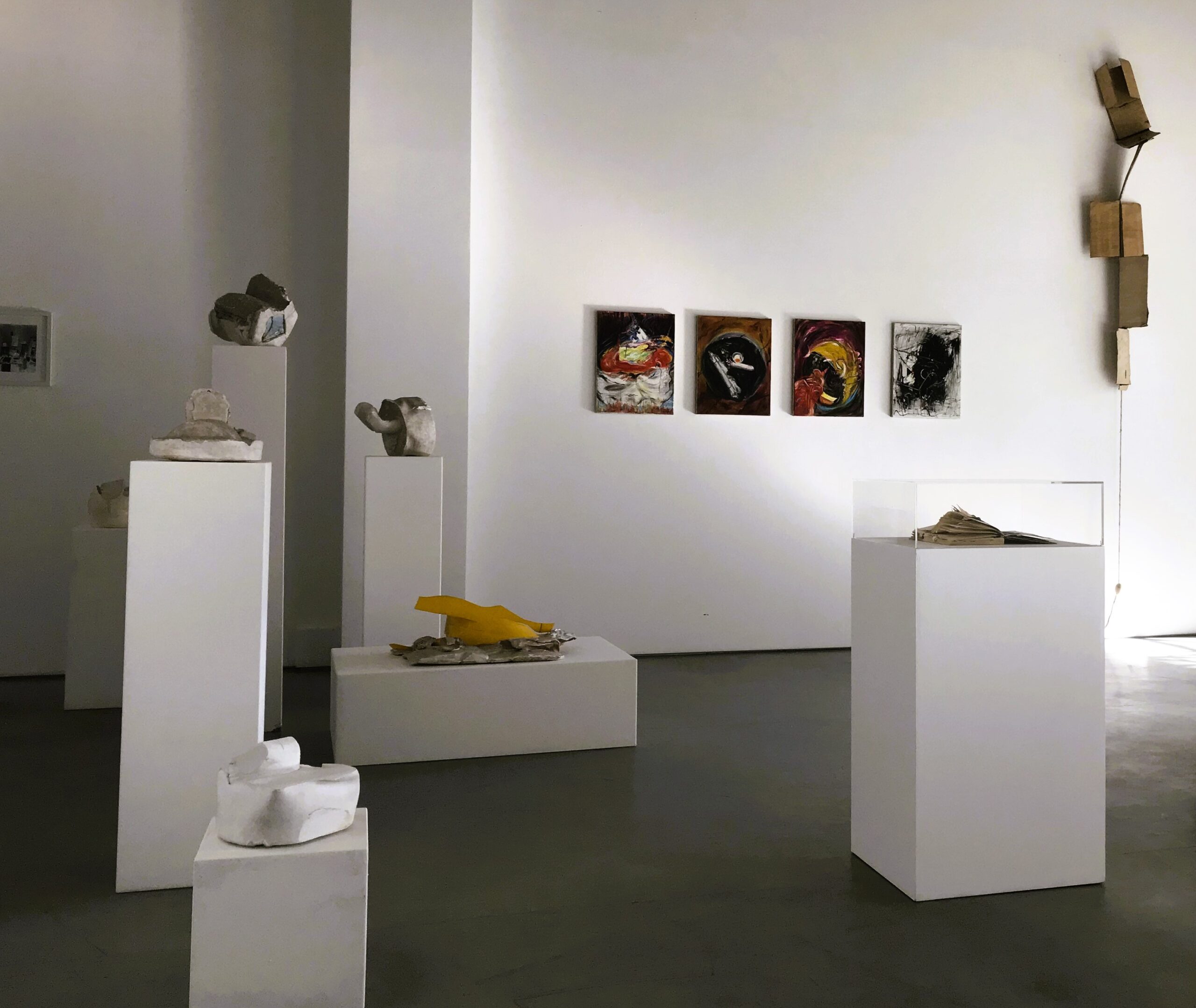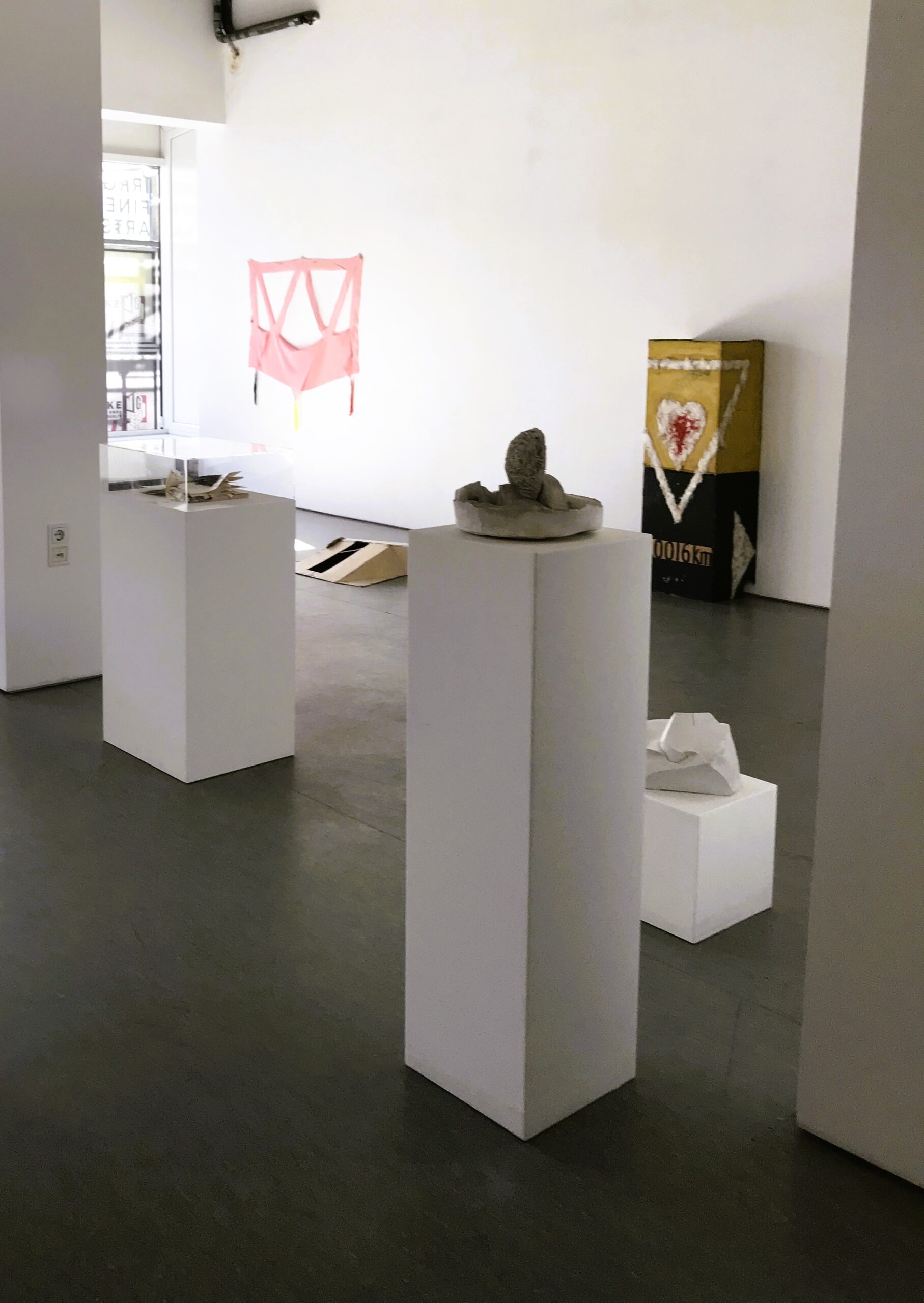 Karlheinz Schäfer nutzte auf den Straßen Berlins gefundene Kartonagen für seine avantgardistischen Kartonarbeiten, die an der Wand montiert sind oder auf dem Boden liegen. In der Galerie Schweinebraden stellte der Künstler 1976 unter dem Titel „Hommage an Robert Filliou“ erstmals seine Kartonobjekte aus und fand damit eine Alternative zu den zensierten Ausstellungen in Kulturhäusern. Hier erhielt er zudem augenfällige Anregungen durch Werke von Joseph Beuys. Werkstitel wie „Rednerpult“, „Eierschleuder“, „Pest“ und „kniefällig“ implizieren sowohl kritische als auch humoristische Aspekte der Arbeiten.