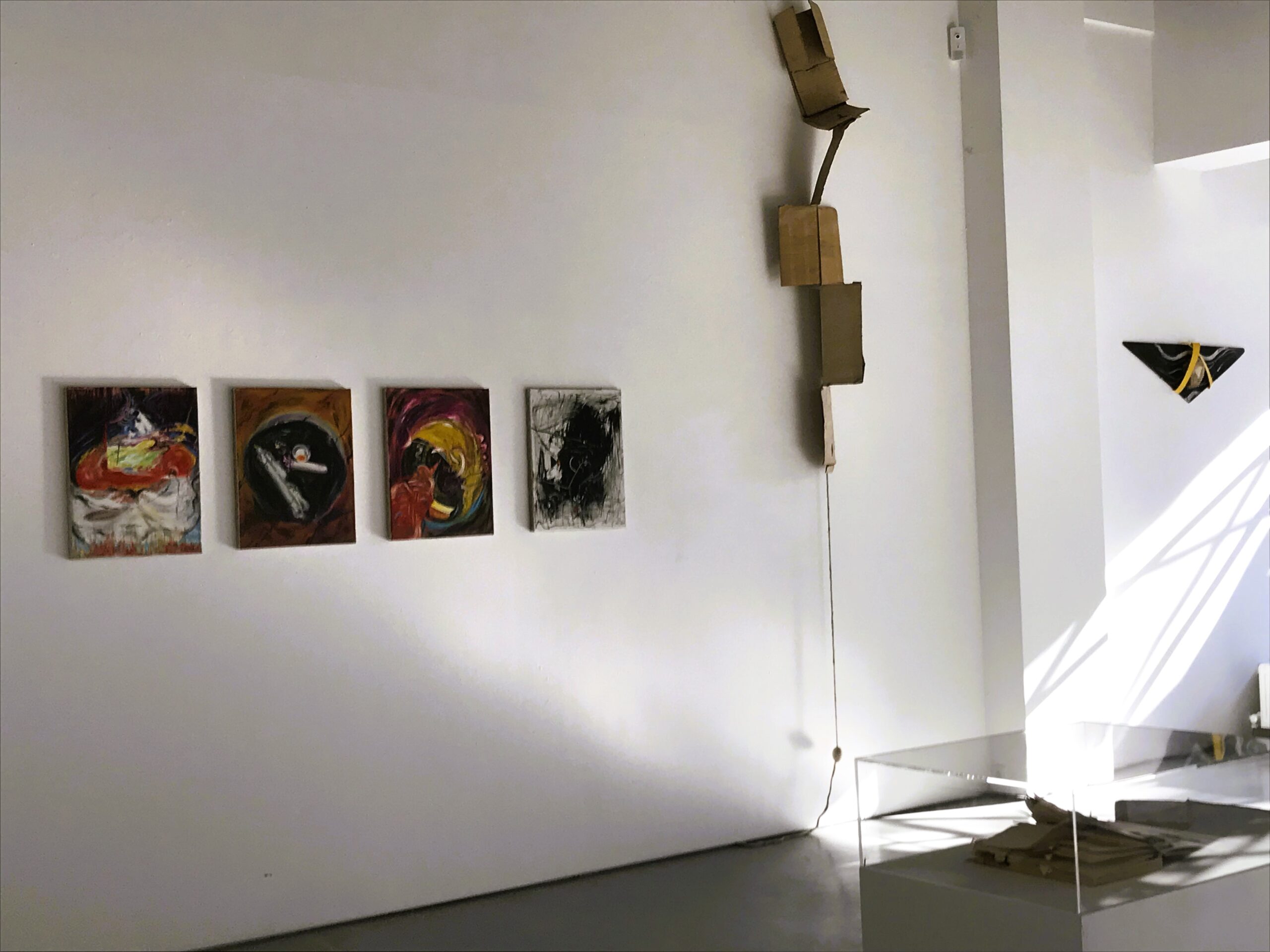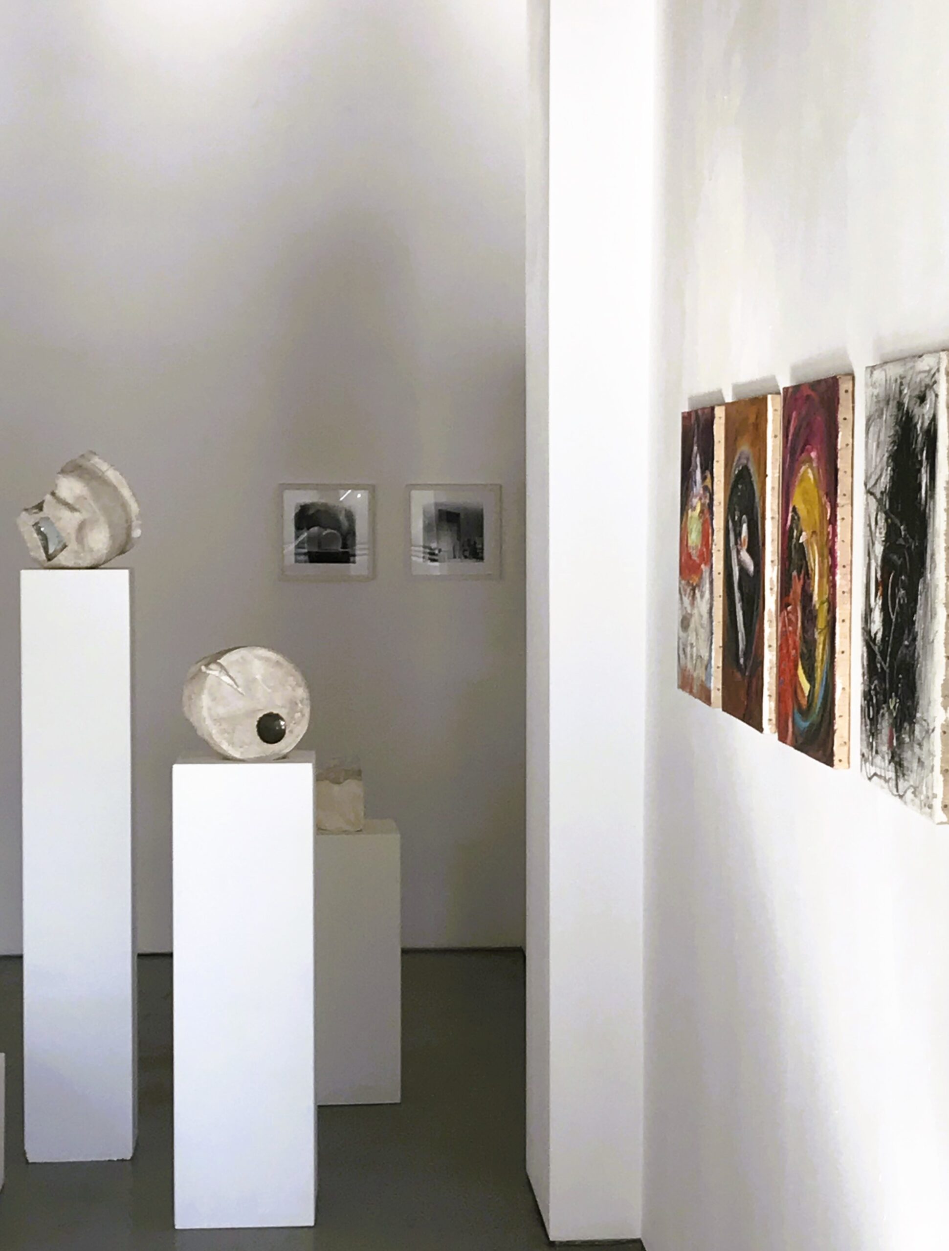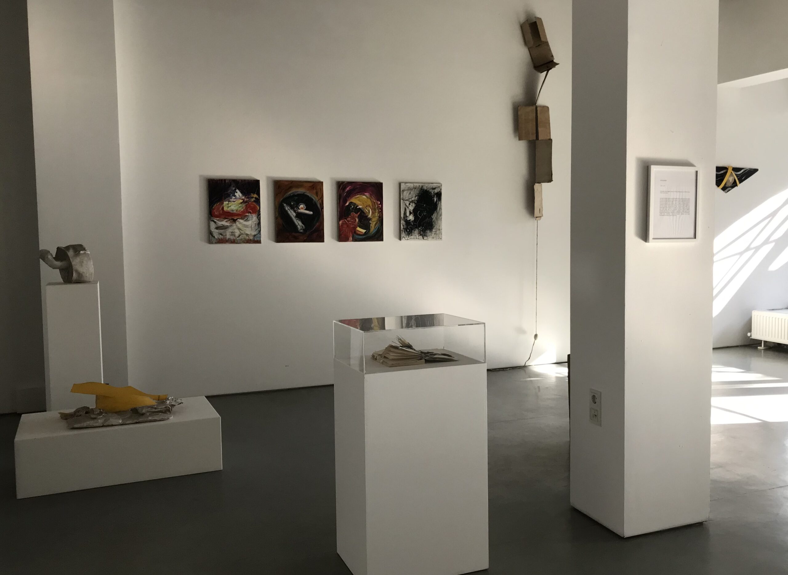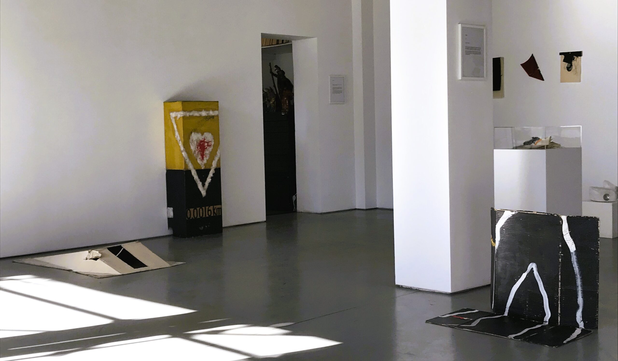 Wie A.R. Penck, Achim Freyer und Jürgen Schweinebraden gehört Karlheinz Schäfer (*1941) zur Avantgarde der ostdeutschen Kunst. Seine Werke verweigerten sich den Ideologien dieser Zeit. Sie sind Zeugnis eines autonomen Künstlerlebens in der DDR. Pappmaché und gefundene Kartonagen in geometrischen Grundformen zeugen von der Absage an den Menschen, der Unmöglichkeit eines freien künstlerischen Schaffens. Subtil spinnt der Künstler die Farben der deutschen Flagge als kritisches Moment in seine Werke ein. Sie stehen synonym für Tod, Liebe und Sonne.