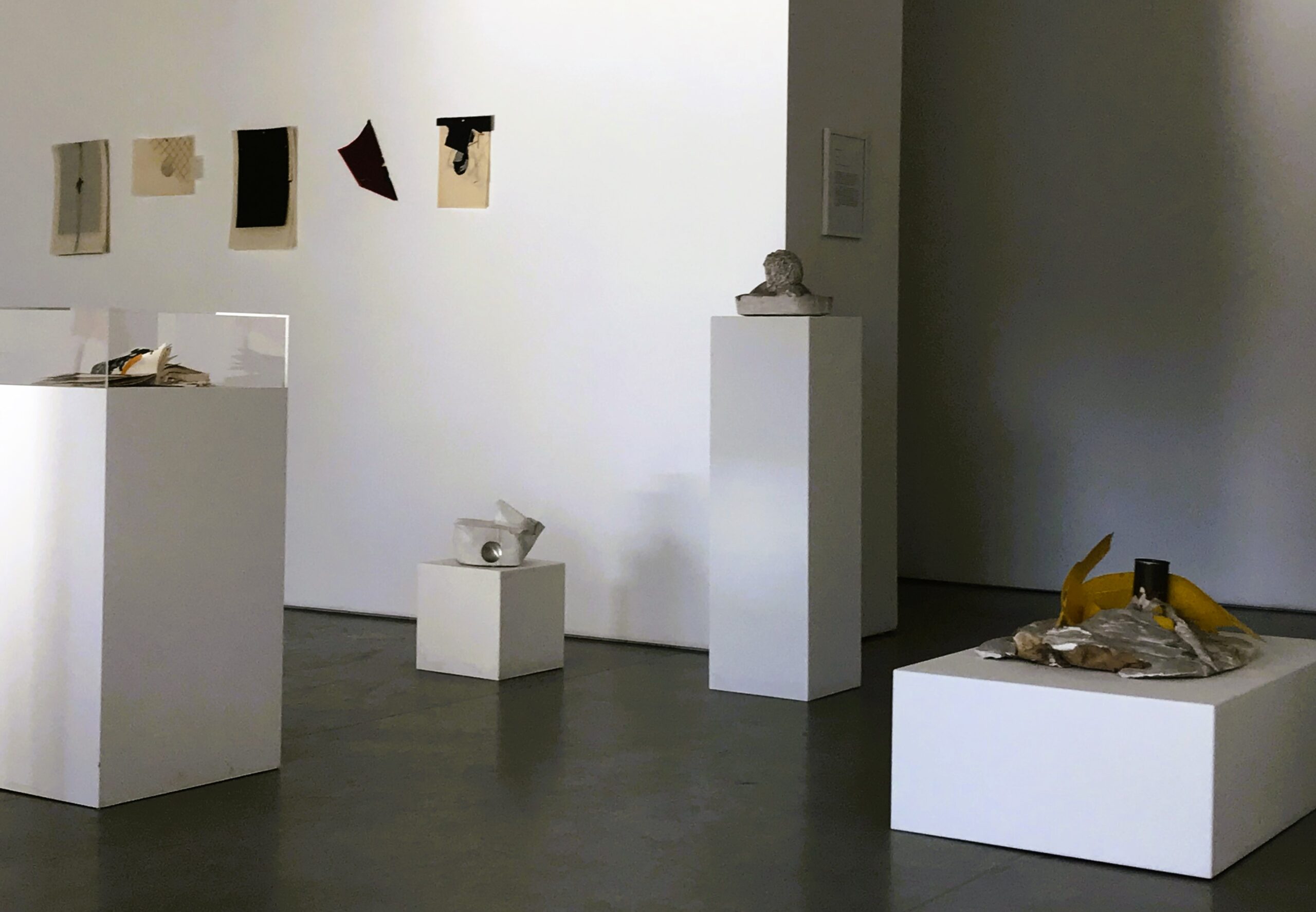Gefundene Kartonagen (objets trouvés), Glanzpapier, Acrylfarbe, Gips, Draht, Textil, Stein